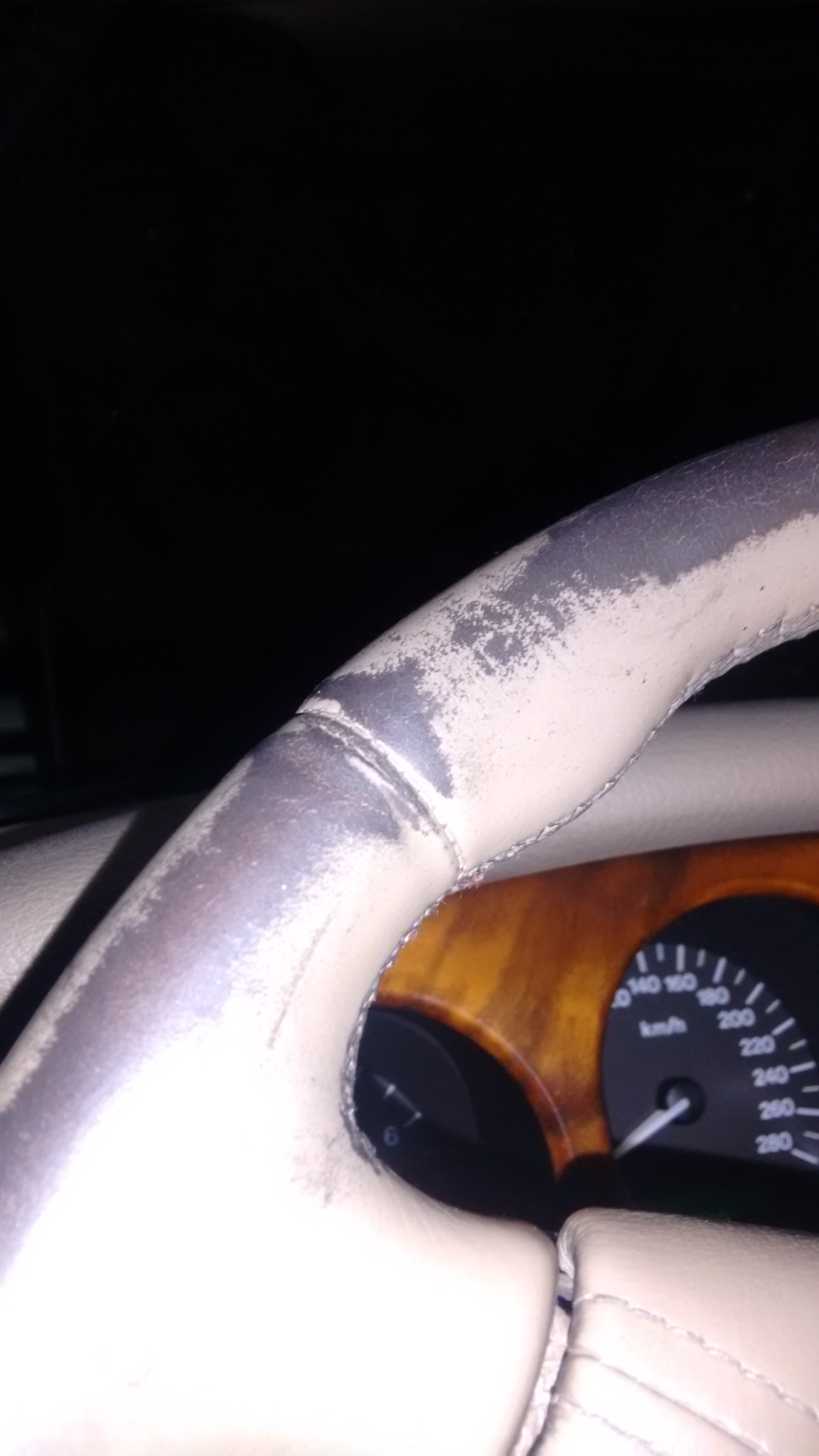 Bueno, pues aquí os dejo unas fotos de los desperfectos de tapicería y volante. Como veis están bastante mal, por favor, dadme vuestra opinión, lo veis recuperable? Supongo que necesitaré mucha mucha paciencia y más de un bote de cuero líquido, pero creéis que conseguiré que quede bien?