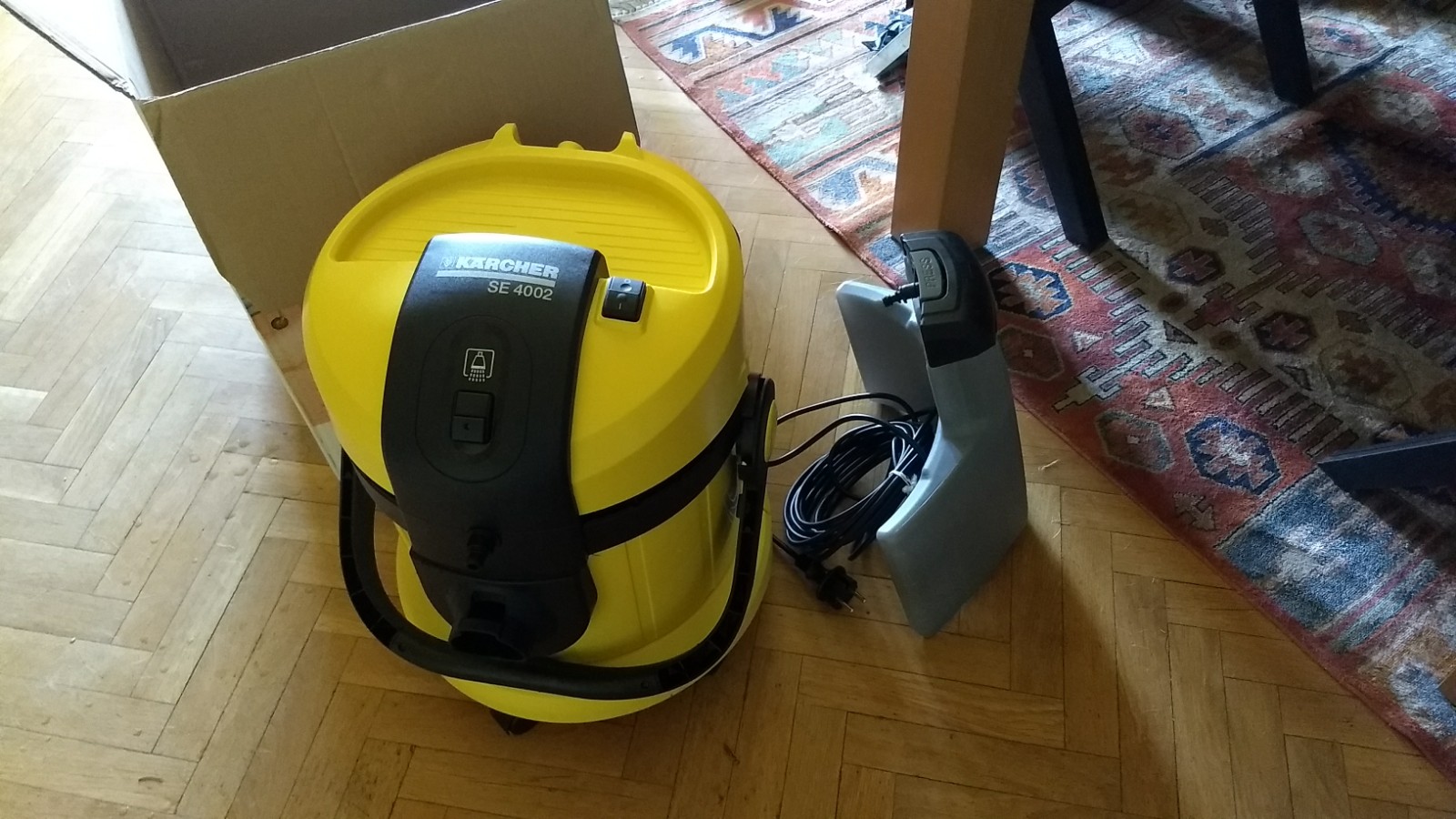 Hoy me ha llegado la Karcher se 4002, que es una aspiradora, con pulverizacion de liquido detergente. Esto es perfecto para limpiar tapicerias, ya que echa el liquido detergente y a la vez lo aspira.