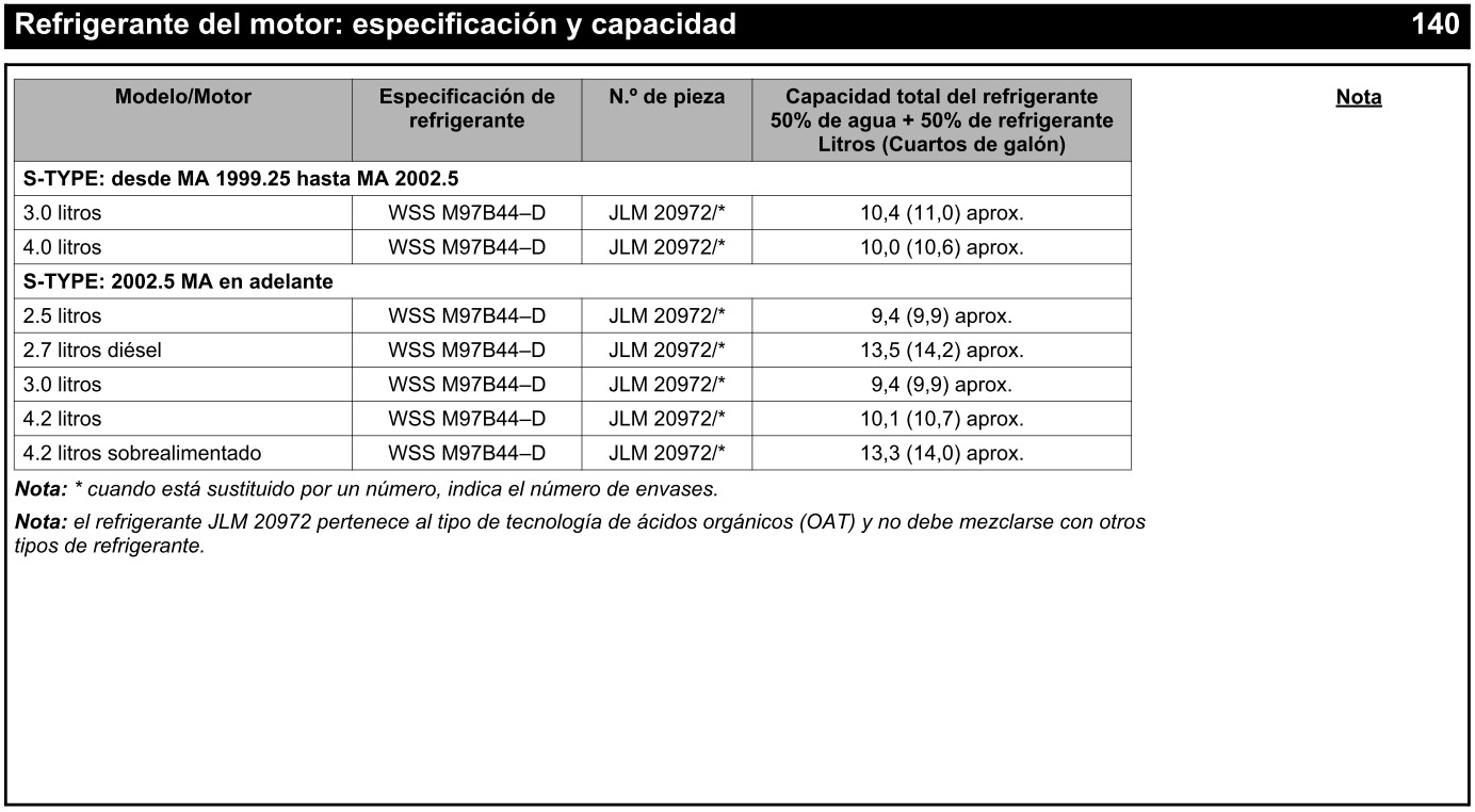 Ambos vehículos, el S-type con motor gasolina 3.0 anterior a 2003 y el XK con motor gasolina 4.2 posterior a 2003, han sido fabricados en la época en que Jaguar perteneció a FORD, por tanto, la especificación del anticongelante es de FORD.