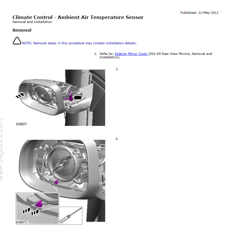 Si bien el manual eléctrico es muy malo (respecto de lo que nos tenía acostumbrados Jaguar), tiene una cosa buena y es que usa las mismas referencias para las mismas secciones, correspondientes a los mismos subsistemas. En el caso que nos ocupa "501-09" Rear View Mirrors. Buscando en el manual de taller, puedes ir luego al manual eléctrico (desafortunadamente no funcionan los hiperenlaces en el manual eléctrico).