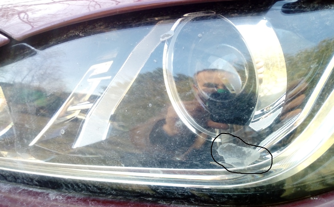 Adjunto fotos en las que se puede observar como se está pelando el cristal del foco delantero izquierdo, parece como si tuviera algún tipo de film protector.