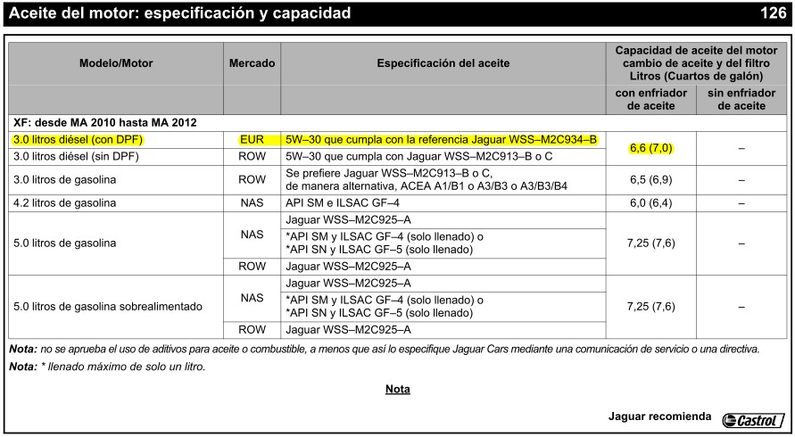 Pongo una copia de las 2 hojas del manual de especificaciones de vehículos Jaguar de 2012. Obsérvese que en el manual de 2009 requerían, tanto para diésel 2.7 con DPF o sin DPF (sin DPF en el sistema de escape Jaguar solo ha fabricado el S-Type X204) aceite que cumpliese con los requisitos FORD: WSS–M2C913–B.
