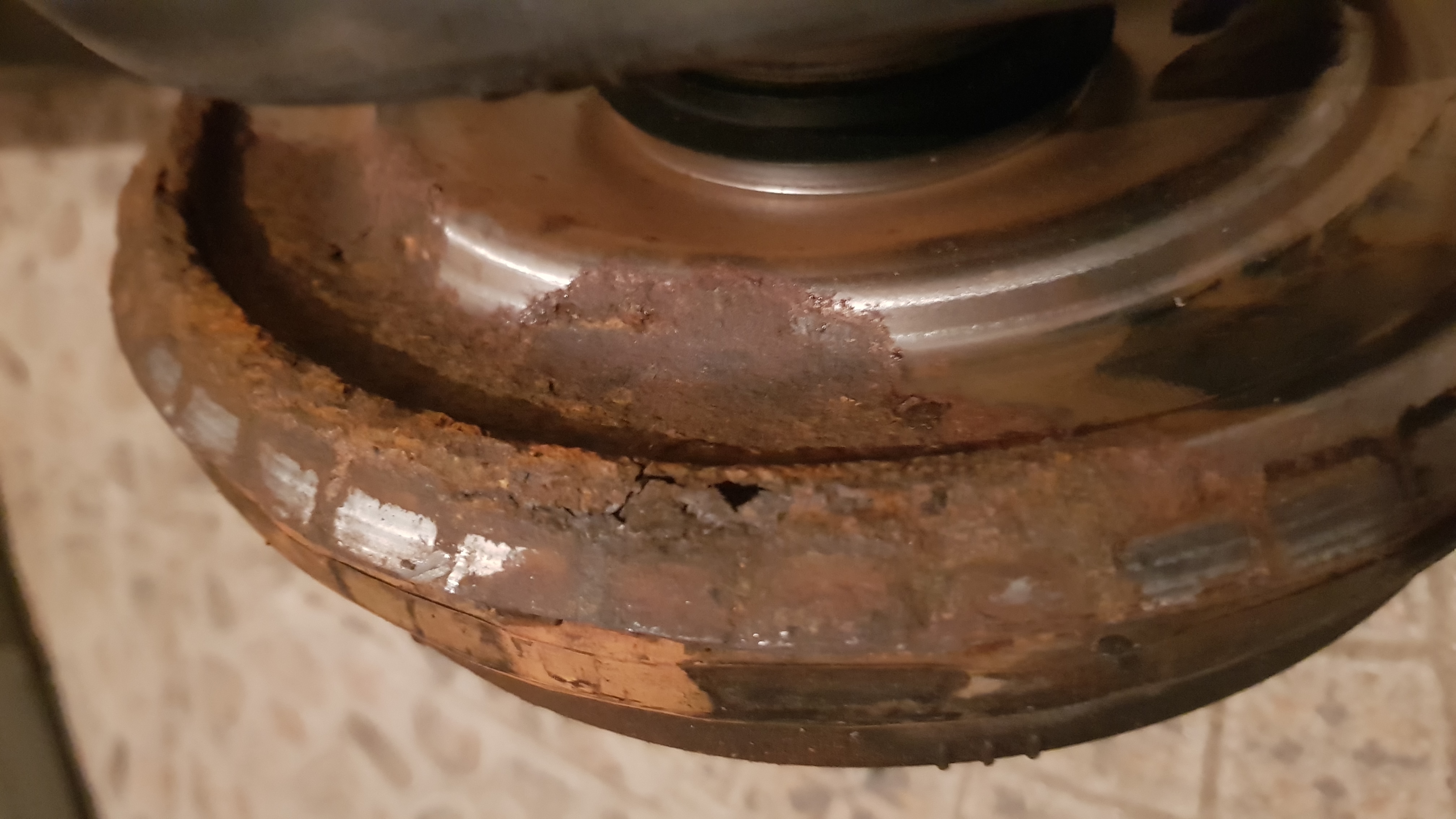 Aquí mando una foto del servo alineado...de las dos cámaras que lleva, la que está oxidada es la que está del lado del pedal de frenos, por lo que el único punto por el que le puede haber entrado algo de líquido de frenos es a través de la unión del cilintro maestro al servo...( va encajado en el agujero superior de la fotografía...), por ahí lleva lleva una junta de goma y además que parece estar manchada, por lo que casi seguro que colado por ahí..., esto no se puede sustituir o evitar...se degrada y como va dentro, el servo acabará con corrosión como me ha ocurrido a mí. No obstante lo miraré más despacio cuando tenga algo más de tiempo, pero es el único punto de unión por el que puede haber pasado líquido de frenos de la cámara del cilindro maestro a la cámara del pedal de frenos...no creo que haya sido por un defecto de fábrica debido a par galvánico, ya que tiene varios puntos de corrosión...en mi opinión lo más lógico es corrosión por líquido de frenos debido a desgaste o deterioro de la unión de las dos cámaras del servo.