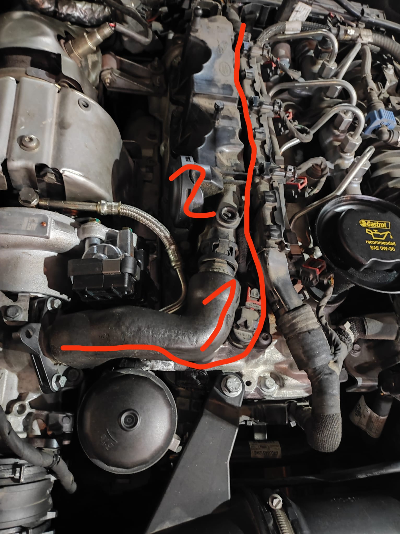 En la imagen la línea roja es la salida de gases, el número 1 es el tubo de la válvula a la EGR ( se desmonta solo tirando, sin herramientas), el número 2 es la válvula de decantado pcv, NO tiene desmontaje, se cambia toda la línea roja y cuesta unos 100€