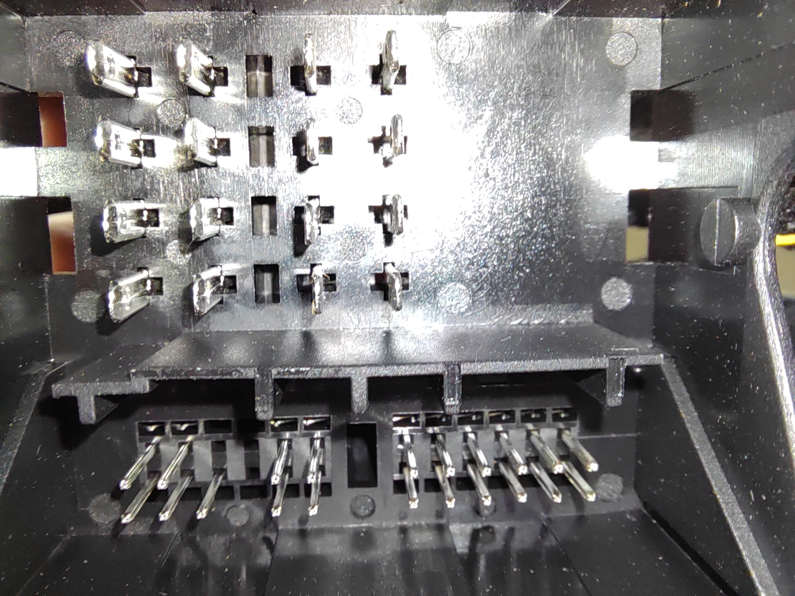 Ambos módulos se conectan al mismo comector. Pero no tengo claro si podría concretarlos con sus cables en cascada sin tener problemas. Llevan ambos unos cables que se ponen entre el conector macho y hembra que lleva el sistema multimedia. Había pensado en intercalar en cadena ambos cables de los dos módulos. Pero no sé si esto puede dar problemas. Entre otras cosas veo que el conector del Carplay/Android auto no lleva todos los pines. Se puede ver en la imagen que adjunto que en la parte inferior izquierda faltan 3 pines.