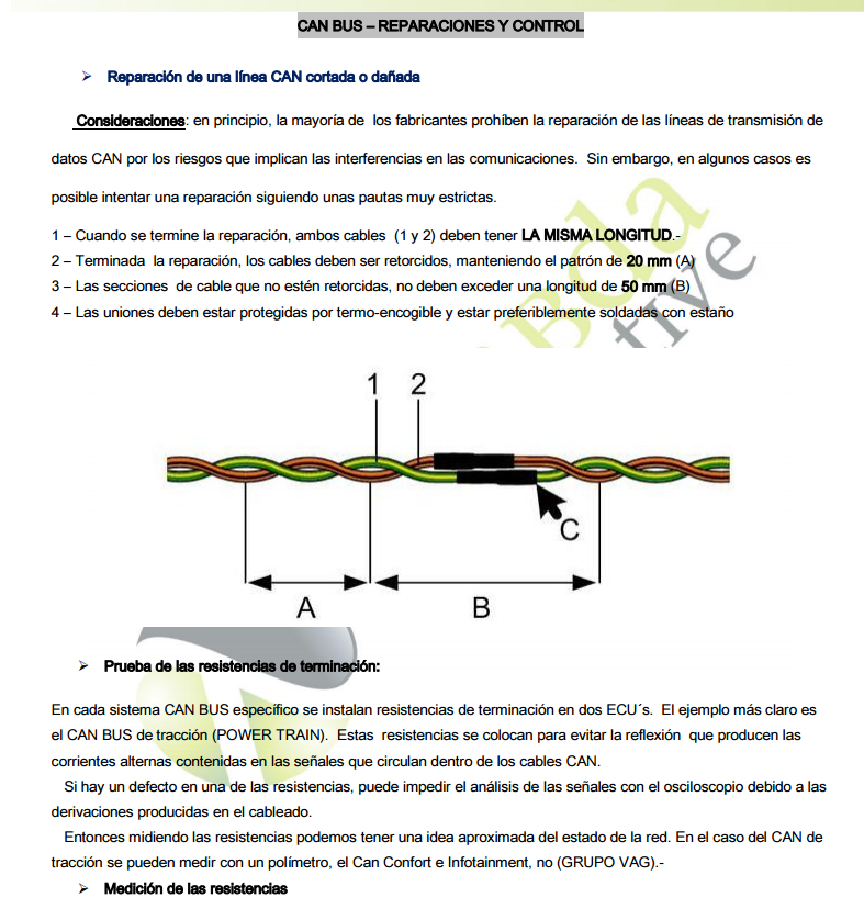 Recuerda que el cable de par trenzado apantallado, de impedancia carcaterística 120 Ohmios, con el que se implanta el bus CAN (Control Area Network), ni se puede estañar, ni se puede empalmar, se tiene que sustituir el tramo completo entre los ECU en que esté mal.