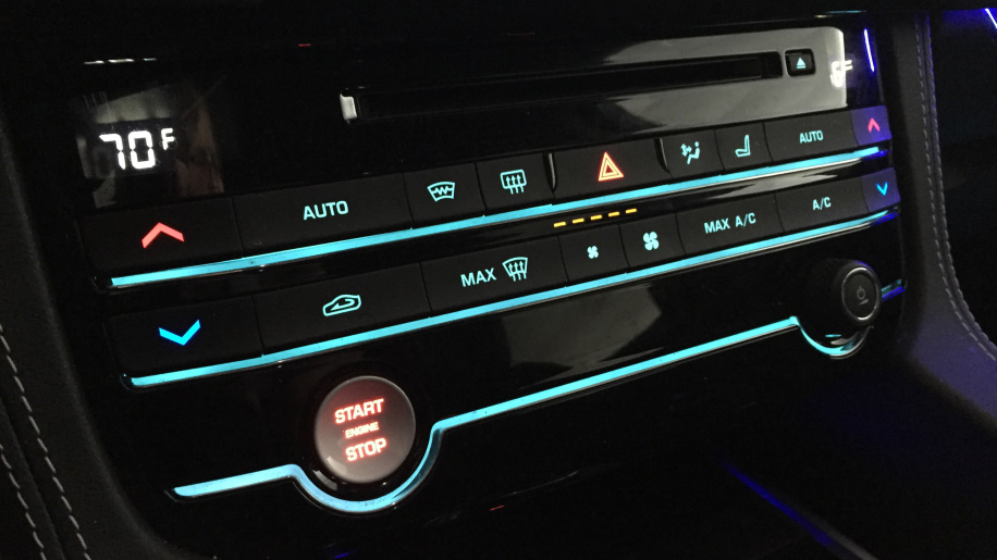 Pero esa satisfacción de tenerlo todo se cambia rápidamente, ya que la consola central y los interruptores son de un solo color que no se puede cambiar. Es cierto que eso es completamente normal, pero a diferencia de muchos otros autos que usan iluminación blanca neutra, los Jag's se iluminan con el mismo color azul / verde azulado que hizo que tu teléfono Razr se viera genial hace muchos años. Y así, ya sea que bañe la cabina con luz azul, roja, violeta o verde, la iluminación ambiental chocará con el interruptor principal. Puedes elegir un tono de azul para la iluminación ambiental que coincide con los interruptores, pero no quiero comprometer mi preferencia de color porque Jaguar no colocó LEDs que serían neutros (o, mejor aún, cambiar para que coincida) la configuración de ambiente).
