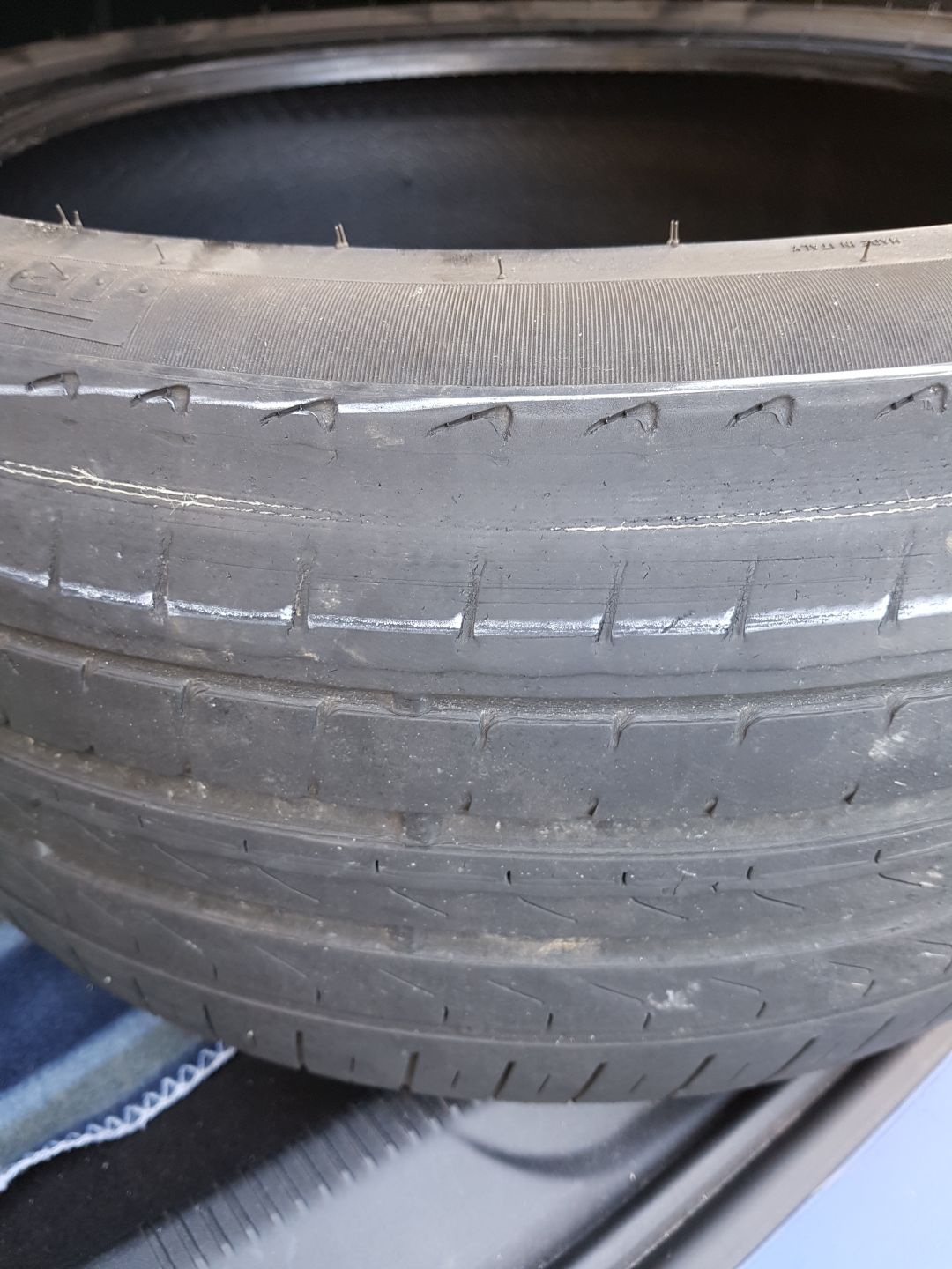 Los neumáticos son pirelli p7 cinturato, medidas 245/40/18, los que traía el coche de serie, podéis apreciar que solo están gastados por el interior de la rueda, el resto del neumático hasta bien, y todo esto tras ser alineado dos veces por culpa de las delanteras.