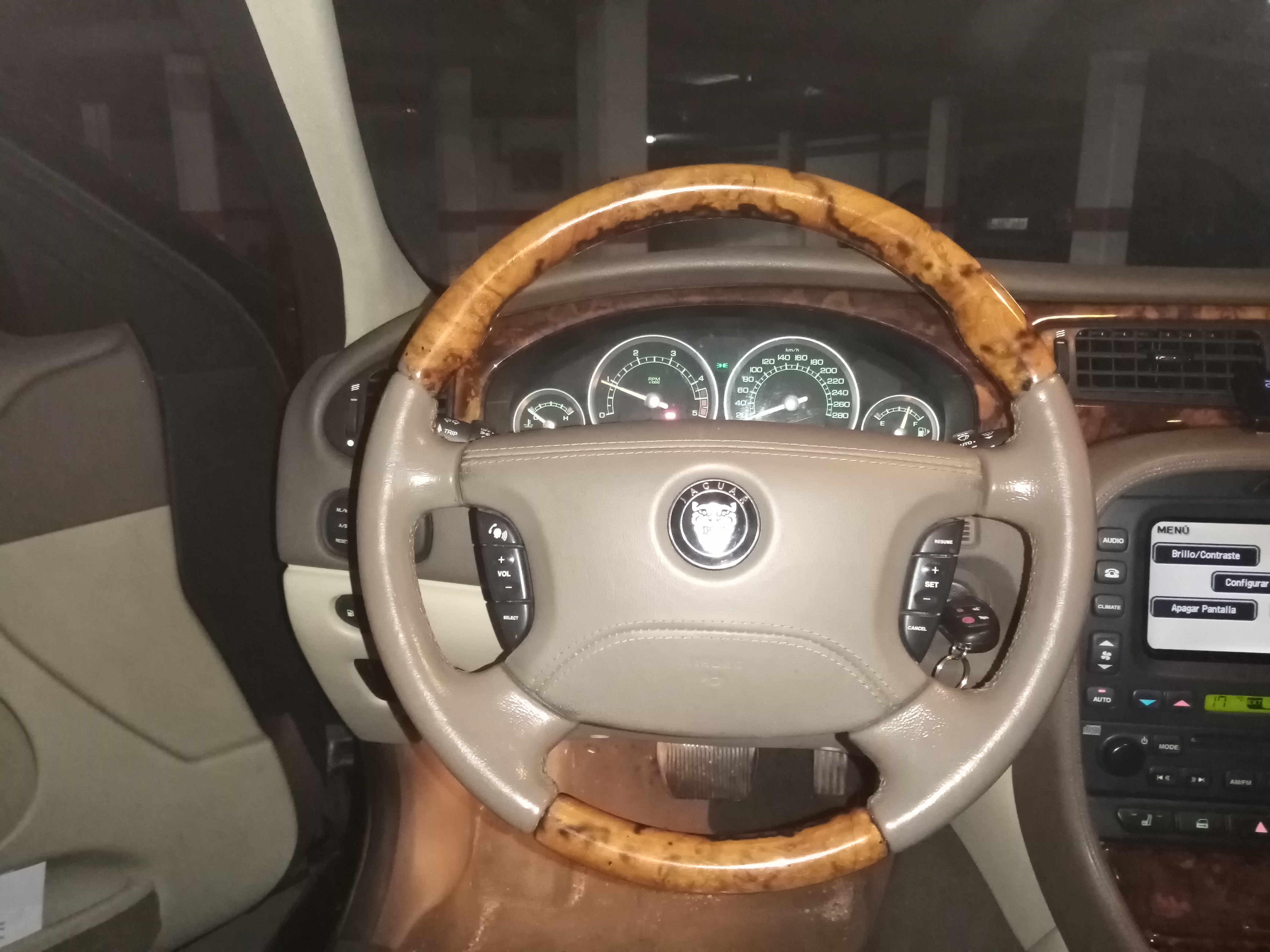Para saber el color del volante, hay que desmontar el airbag, para ello, se desconecta la batería y se tira hacia fuera con cuidado, no hace falta quitar las conexiones, y en la parte de atrás hay una peqatina que indica el color. ( Yo no lo he desmontado, ví un tutorial en youtube de otro jaguar que estaba desmontando la columna de dirección con los mismos colores que el mío y cuando desmontó el airbag me fijé en el color, que es mocha ). El color de los asientos está en la plaquita que hay en la puerta, donde aparece el color