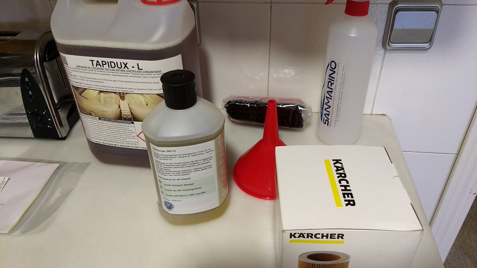 Hoy me ha llegado la Karcher se 4002, que es una aspiradora, con pulverizacion de liquido detergente. Esto es perfecto para limpiar tapicerias, ya que echa el liquido detergente y a la vez lo aspira.