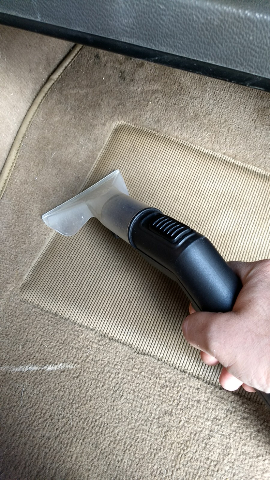 Para hacer una buena limpieza procederemos asi; primeo usaremos el aspirador de la forma tradicional, con el filtro de papel o la bolsa, aspirando perfectamente, todo el vehiculo, luego pondremos el filtro de agua y con la boquilla fina tradicional, y un cepillo humedo jabonoso, frotaremos en los resquicioos con mas mugre, a la vez que aspiramos el agua. Luego a todas las tapicerias y moquetas les daremos con un pulverizador manual, un poco de agua con amoniaco o detergente. Ahora pondremos la boquilla aspersora e iremos pulverizando y absorviendo limpiador, para terminar solo con aspiracion, hasta que se vea que ya no chupa nada de agua.
