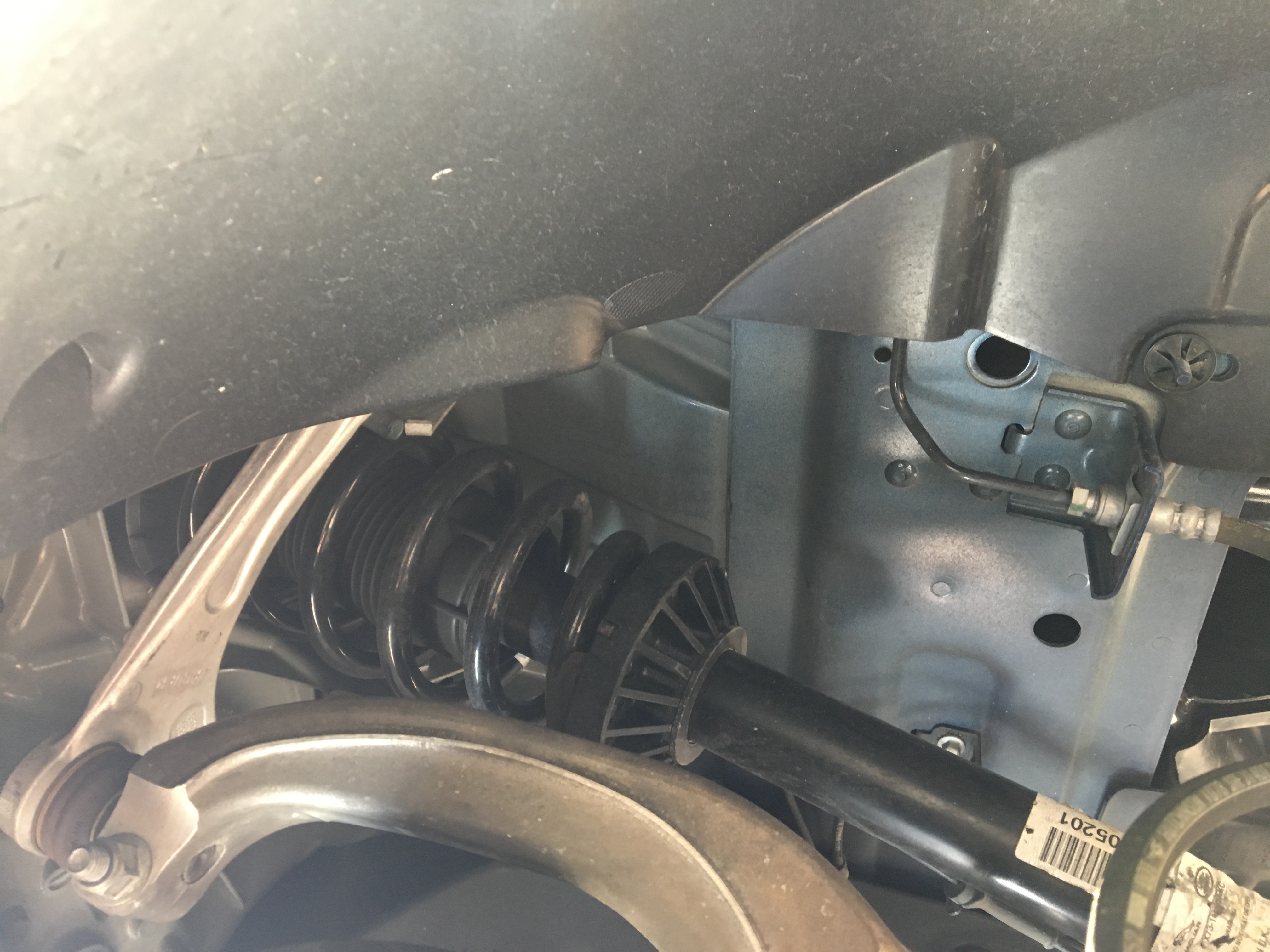 Aparentemente falta el faldón del paso de rueda. Su misión, adicionalmente a atenuar el ruido, es evitar que la rueda al girar, circulando por pavimento mojado, salpique agua o barro a la chapa y ésta se oxide.
