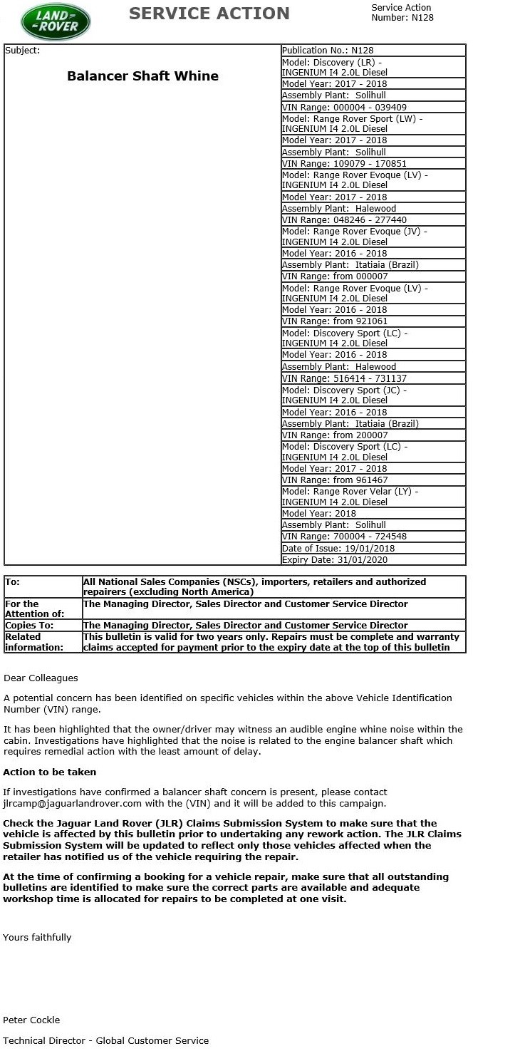 Buenas tardes, soy el propietario del fpace al que le han cambiado los contrarotores enteros por los casquillos defectuosos con solo 13.000km. Parece que es error en motor ingenium 2.0 de determinados VIN y que incluso esta en campaña de revisión (N128) en los evoques. Como digo en el propio post nos me quiero obsesionar con los ruidos, ahora escucho un sonido similar a un silbido cuando acelero fuerte y sobretodo cuando se ha calentado el coche, es mas continuo y suena mas acorde con el motor, no como el anterior que era mas acusado. Hasta que me dijeron lo de los contrarotores empezaron con el turbo que me pusieron uno nuevo, osea , ahora tengo los 2 contrarotores cambiados y turbo nuevo. Igual este ruido estaba antes pero no me habia fijado. Sigue con la tónica de que la caja zf mantiene el coche con muy pocas revoluciones y se pone rápido con 1600 rev y tiembla un poco, desaparenciendo una vez pasas las 1.900 (pero este problema ya lo tenía con mi xf). Buenos ya seguimos viendo como vamos. Saludos.