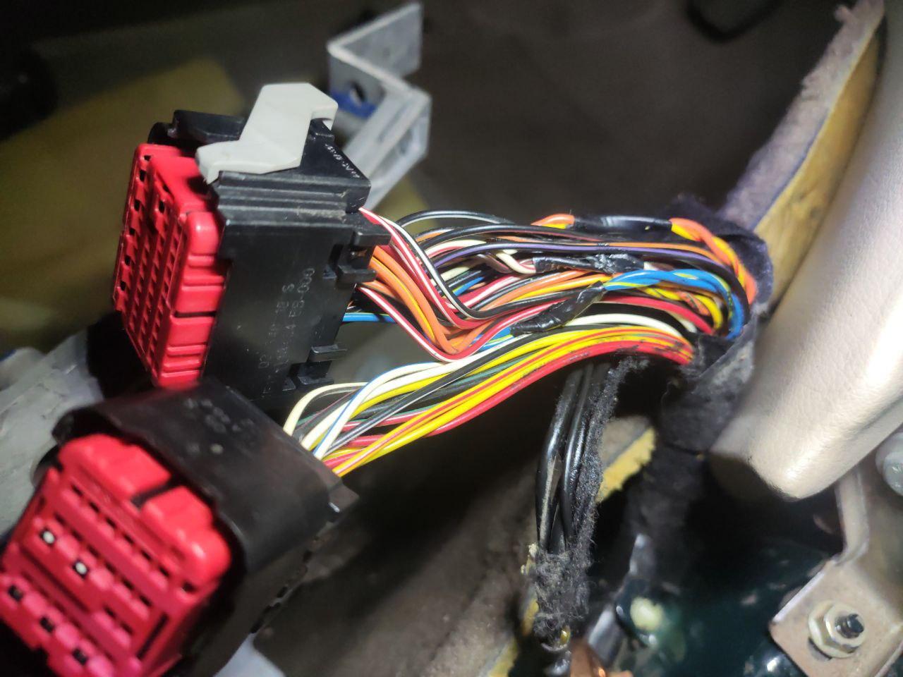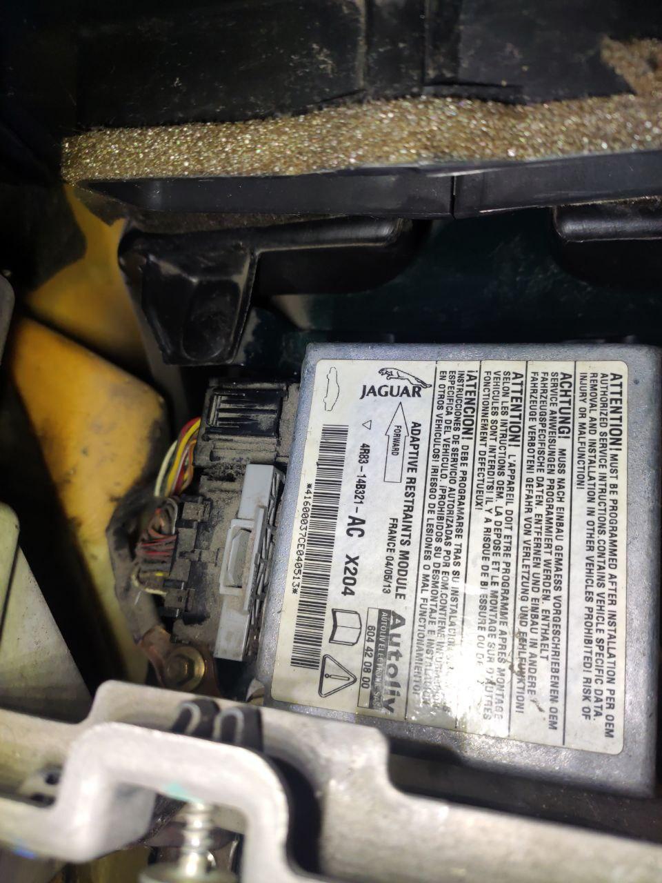 Esa cinta aislante plástica no es de fábrica. Jaguar usa cinta aislante con base de tela (para que dure) como la que tienes cerca de los conectores. Fijate, tomando como referencia el manual eléctrico, si los circuitos y colores coincide lo ejecutado en los conectores con lo especificado en el manual. Eso tiene pinta de haber sido chapuceado antes.