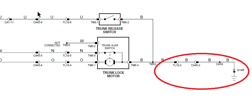Entiendo que debe estar cortada o sin continuidad la linea Ground o Black en el tramo que comparten las luces de la placa de matricula con el sistema de accionamiento interruptor motor cerradura maletero, señalado en rojo en ambos esquemas.