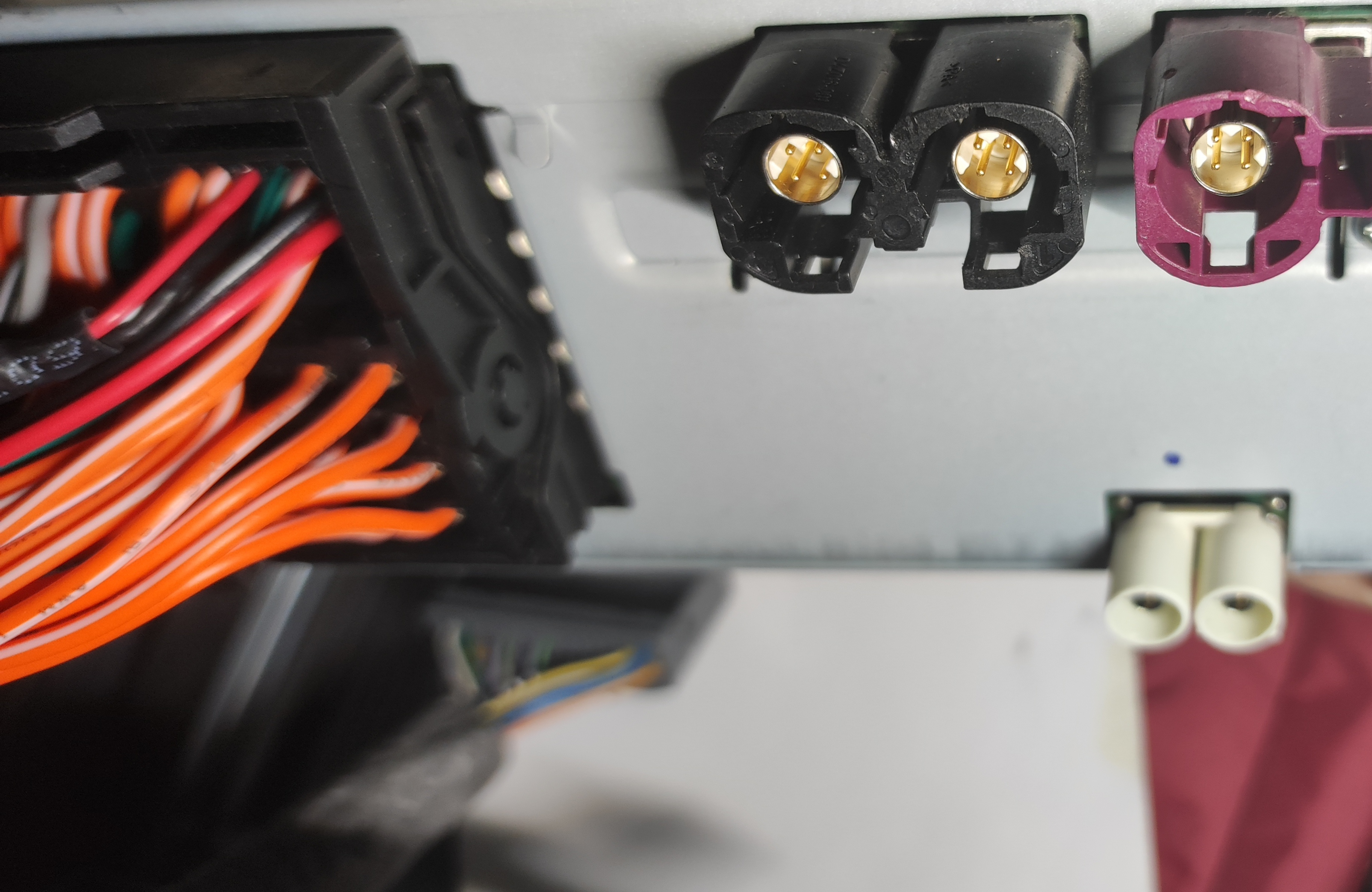Ambos módulos se conectan al mismo comector. Pero no tengo claro si podría concretarlos con sus cables en cascada sin tener problemas. Llevan ambos unos cables que se ponen entre el conector macho y hembra que lleva el sistema multimedia. Había pensado en intercalar en cadena ambos cables de los dos módulos. Pero no sé si esto puede dar problemas. Entre otras cosas veo que el conector del Carplay/Android auto no lleva todos los pines. Se puede ver en la imagen que adjunto que en la parte inferior izquierda faltan 3 pines.