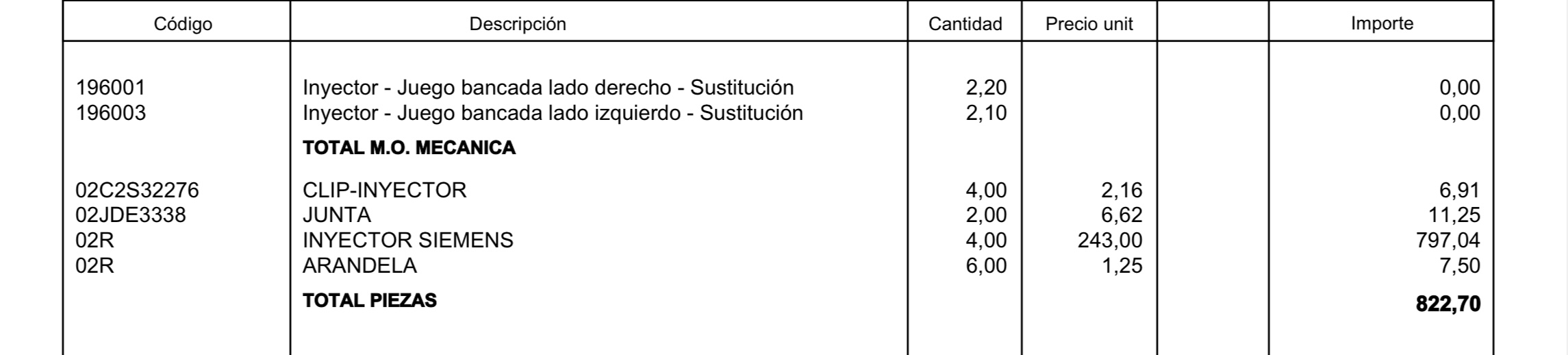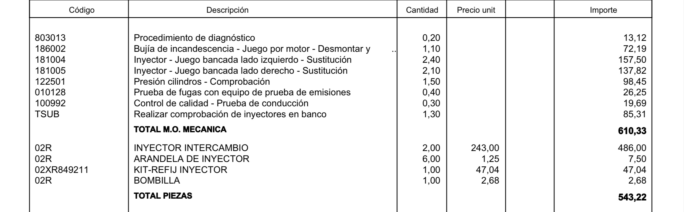 Al final se sustituyeron los 6 inyectores. Podrás observar que en la primera factura aparece INYECTOR DE INTERCAMBIO 2 unidades a 243€/ud, y en la segunda aparece INYECTOR SIEMENS 4 unidades a 243€/ud. Entiendo por tanto que no debo preocuparme por las toberas de los inyectores, ¿correcto?