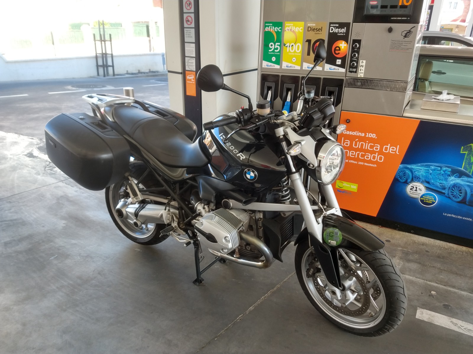 Como vivo cerca de ka gasolinera de Herrera Oria, he dejado mi BMW R1200R, en reserva y he puesto la de 100 octanos, ya que desde que la compre (2006), siempre he puesto 98, al ser la recomendada por el fabricante, en una pegatina en el deposito, ademas la diferencia de precio es poca.