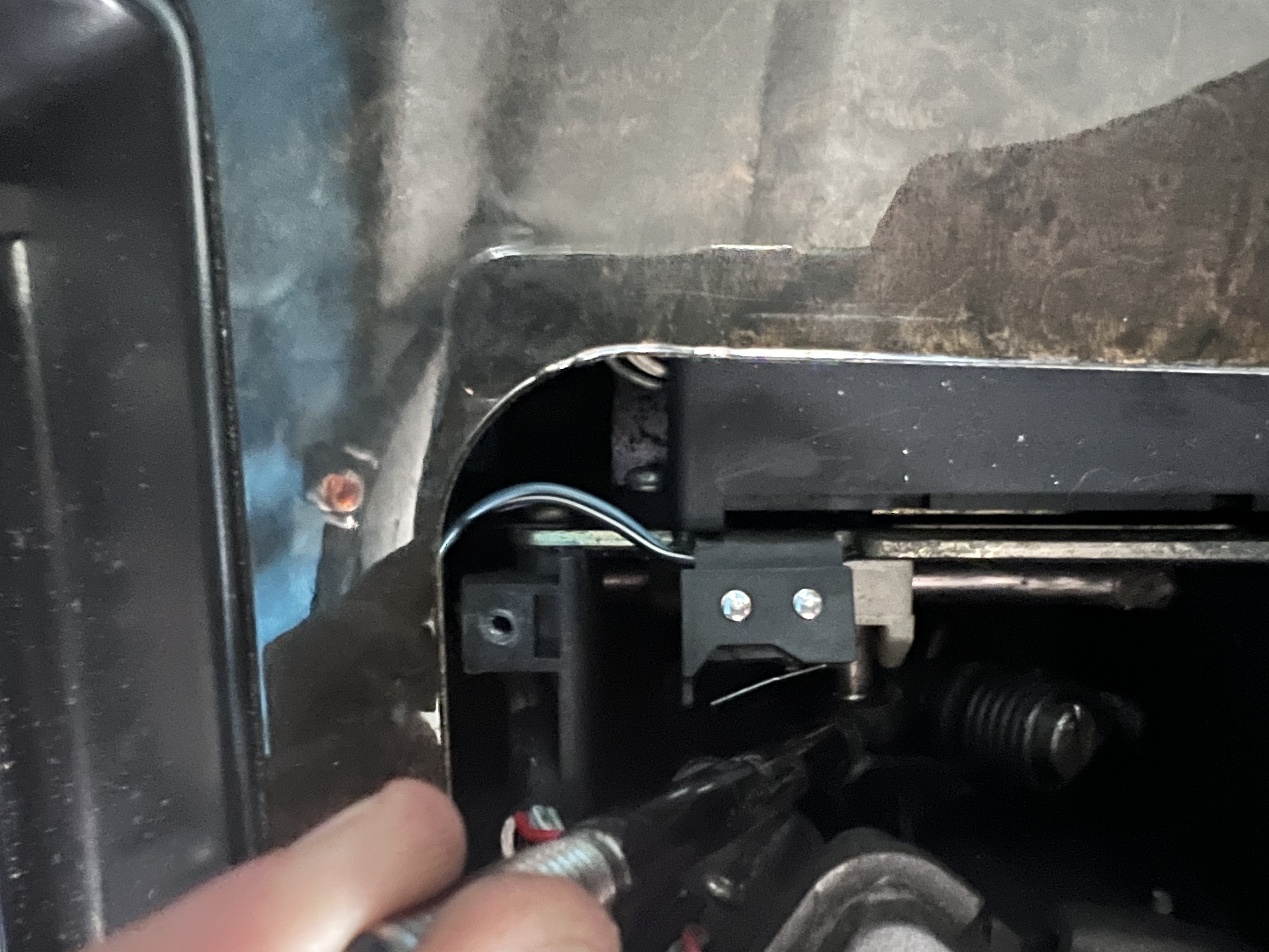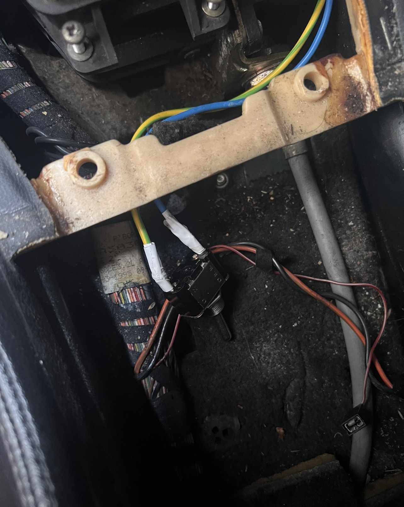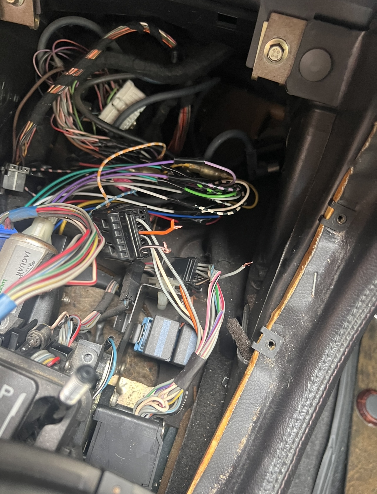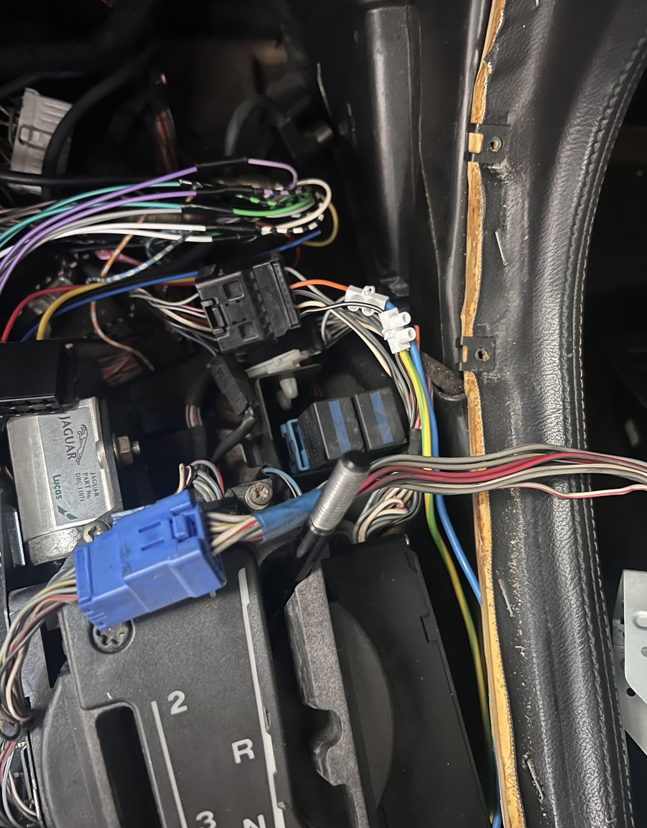 El cable negro es el que entra la corriente al linear switch, el naranja es el que manda la señal de que la palanca está en posición ‘P’, en principio con estos dos cablea valdría, el otro que tengo cortado que es gris y morado es el que hace que se ilumine la ‘P’ del selector. En mi caso he hecho un puente con un interruptor entre estos cables. He dejado también los cables originales unidos de nuevo, ya que si no no funcionaría la luz de marcha atrás al poner la palanca en R, y tampoco se iluminarían las letras en el selector.